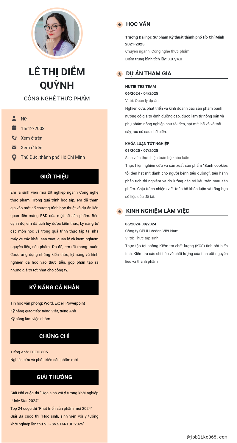 Xem hồ sơ ứng viên LÊ THỊ DIỄM QUỲNH cần 2 điểm. Hồ sơ được cập nhật ngày: 07/08/2025