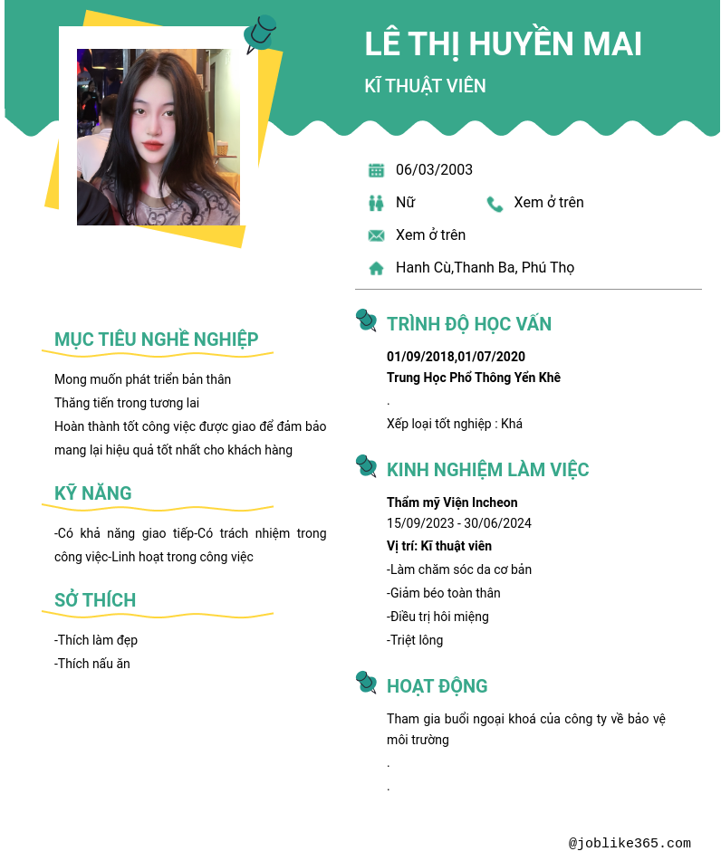 Xem hồ sơ ứng viên LÊ THỊ HUYỀN MAI cần 2 điểm. Hồ sơ được cập nhật ngày: 09/07/2024