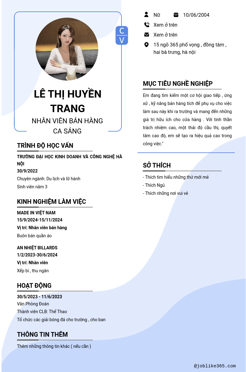 Xem hồ sơ ứng viên cần 2 điểm. Hồ sơ được cập nhật ngày: 11/11/2024