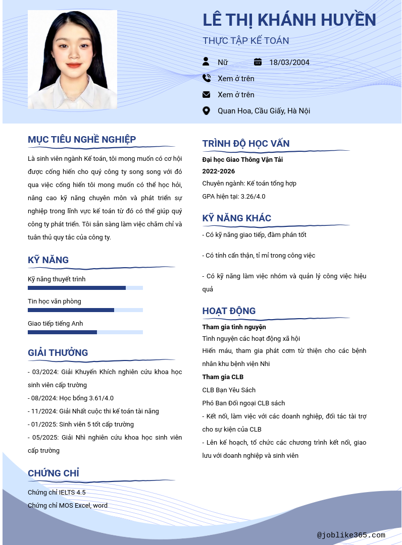 Xem hồ sơ ứng viên LÊ THỊ KHÁNH HUYỀN cần 2 điểm. Hồ sơ được cập nhật ngày: 27/10/2025
