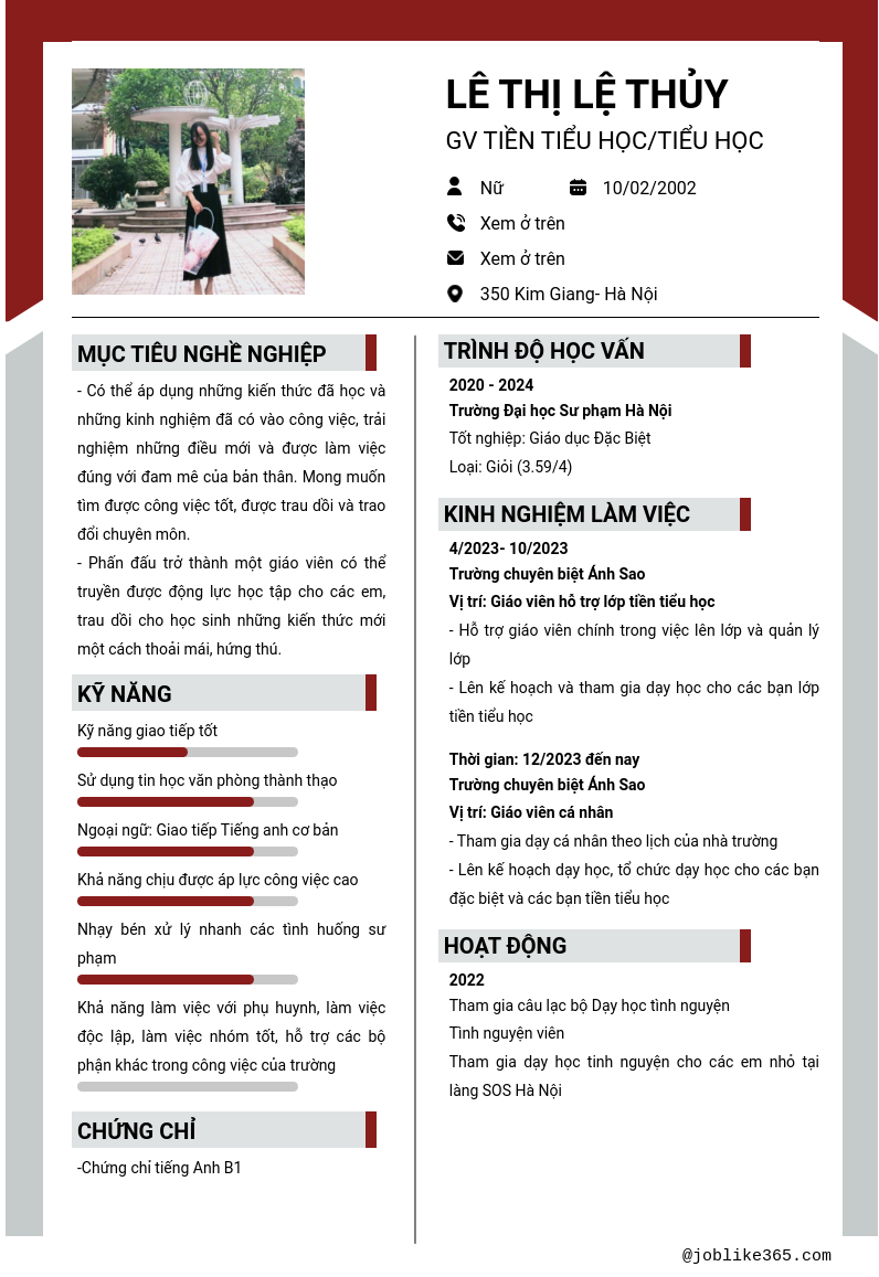 Xem hồ sơ ứng viên lê thị lệ thủy cần 2 điểm. Hồ sơ được cập nhật ngày: 30/12/2024