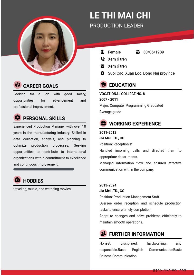 Xem hồ sơ ứng viên LE THI MAI CHI cần 2 điểm. Hồ sơ được cập nhật ngày: 12/07/2024