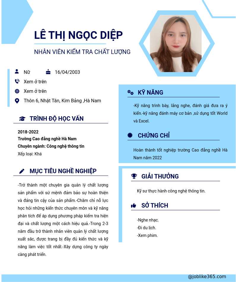 Xem hồ sơ ứng viên LÊ THỊ NGỌC DIỆP cần 2 điểm. Hồ sơ được cập nhật ngày: 25/02/2025