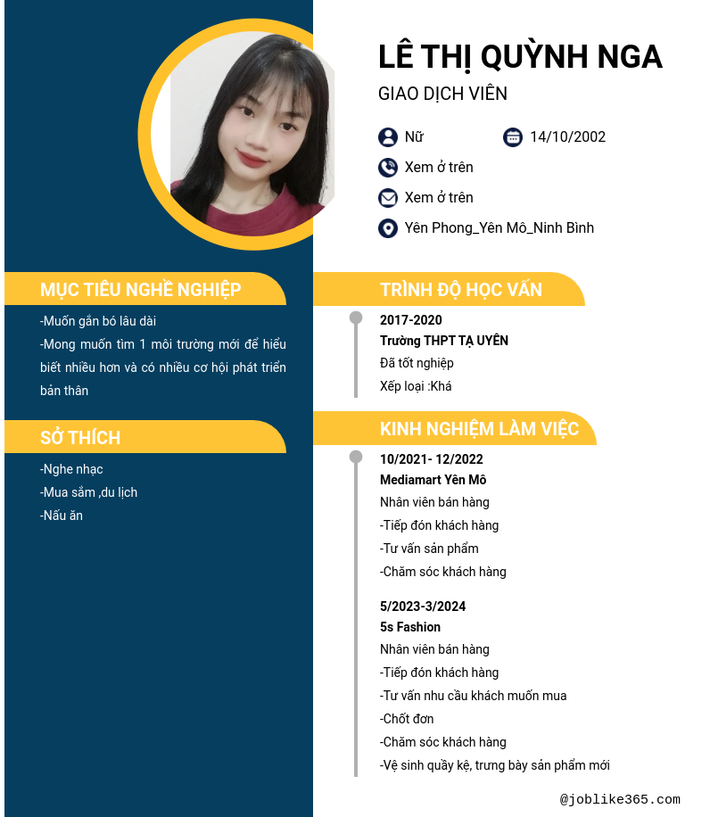 Xem hồ sơ ứng viên LÊ THỊ QUỲNH NGA cần 2 điểm. Hồ sơ được cập nhật ngày: 14/05/2025