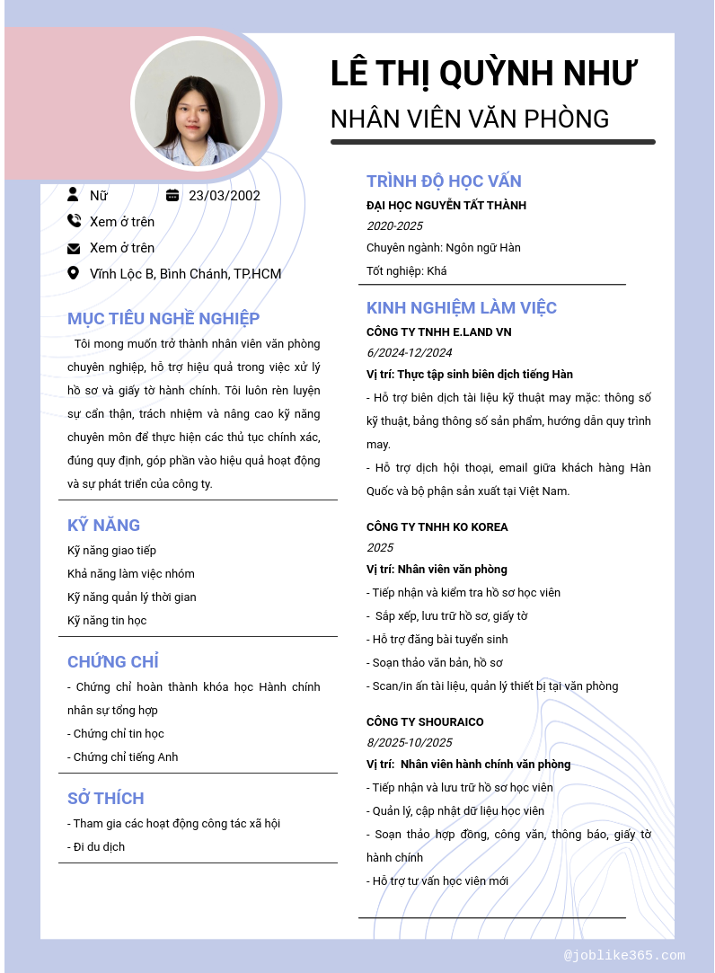Xem hồ sơ ứng viên Lê thị quỳnh như cần 2 điểm. Hồ sơ được cập nhật ngày: 16/11/2025