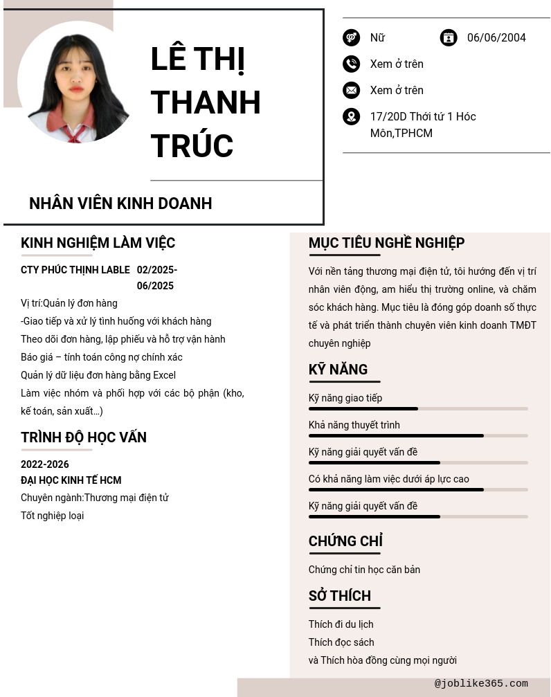 Xem hồ sơ ứng viên LÊ THỊ THANH TRÚC cần 2 điểm. Hồ sơ được cập nhật ngày: 23/07/2025