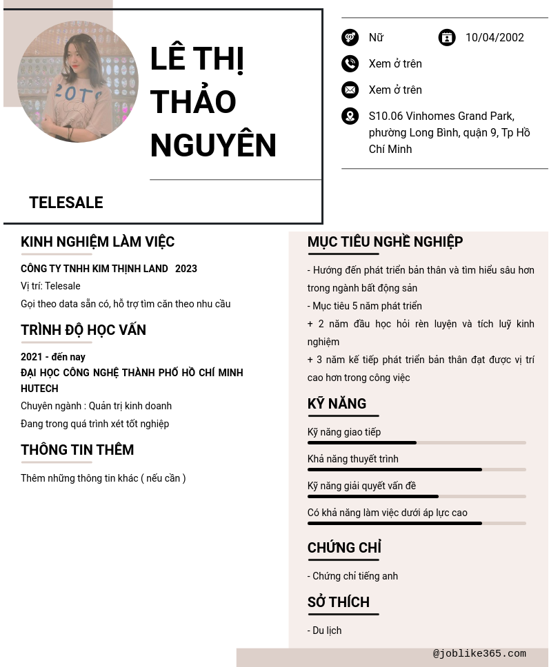 Xem hồ sơ ứng viên Lê Thị Thảo Nguyên cần 2 điểm. Hồ sơ được cập nhật ngày: 06/08/2024