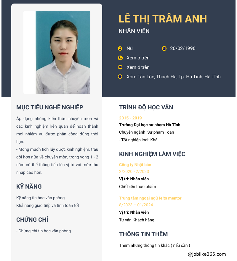 Xem hồ sơ ứng viên LÊ THỊ TRÂM ANH cần 2 điểm. Hồ sơ được cập nhật ngày: 11/02/2025