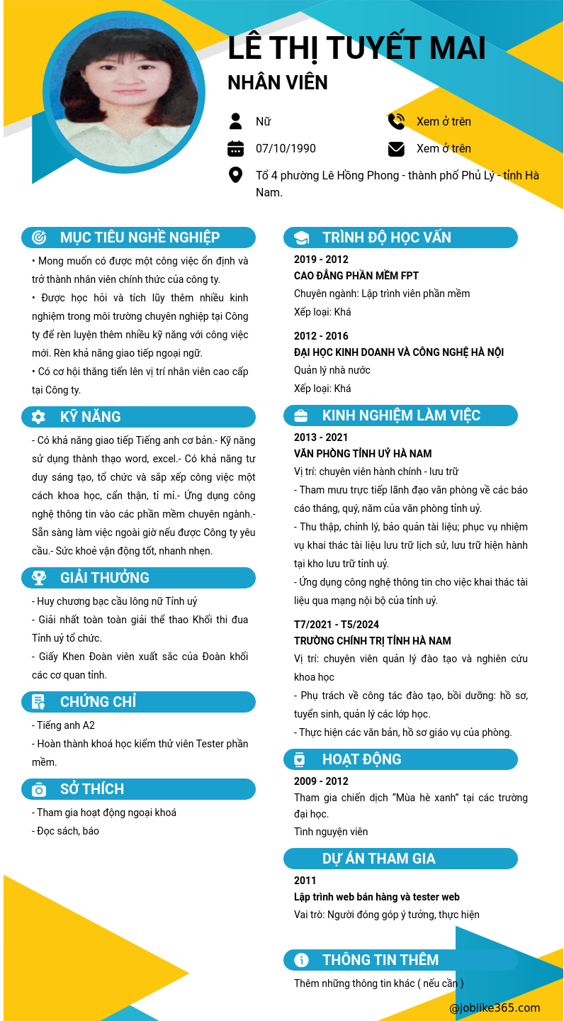 Xem hồ sơ ứng viên LÊ THỊ TUYẾT MAI cần 2 điểm. Hồ sơ được cập nhật ngày: 14/06/2024