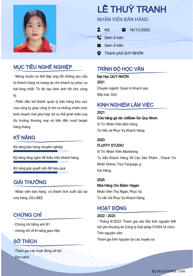 Xem hồ sơ ứng viên LÊ THUỲ TRANH cần 2 điểm. Hồ sơ được cập nhật ngày: 08/02/2026