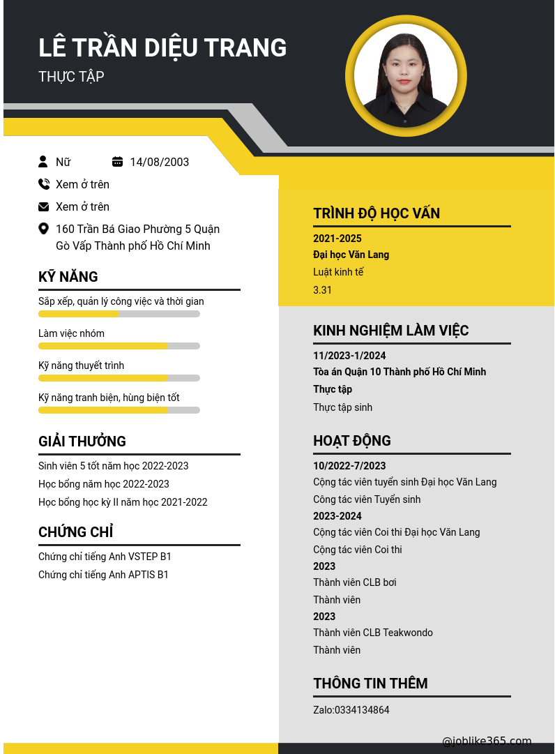 Xem hồ sơ ứng viên LÊ TRẦN DIỆU TRANG cần 2 điểm. Hồ sơ được cập nhật ngày: 24/05/2024