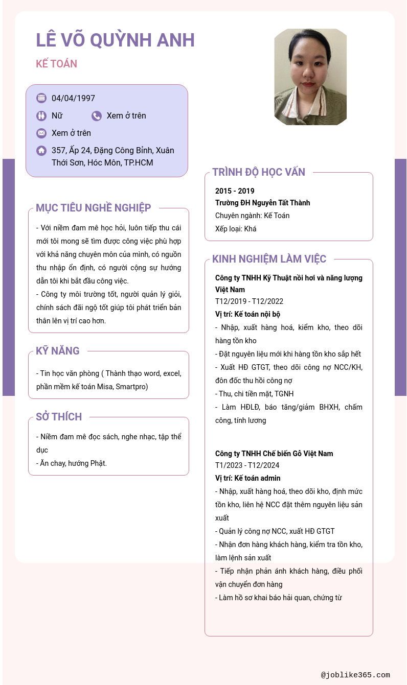 Xem hồ sơ ứng viên LÊ VÕ QUỲNH ANH cần 2 điểm. Hồ sơ được cập nhật ngày: 22/01/2025