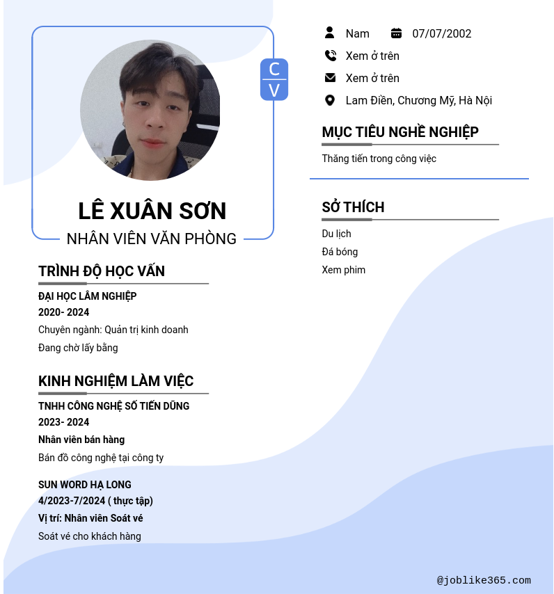 Xem hồ sơ ứng viên Lê Xuân Sơn cần 2 điểm. Hồ sơ được cập nhật ngày: 09/08/2024