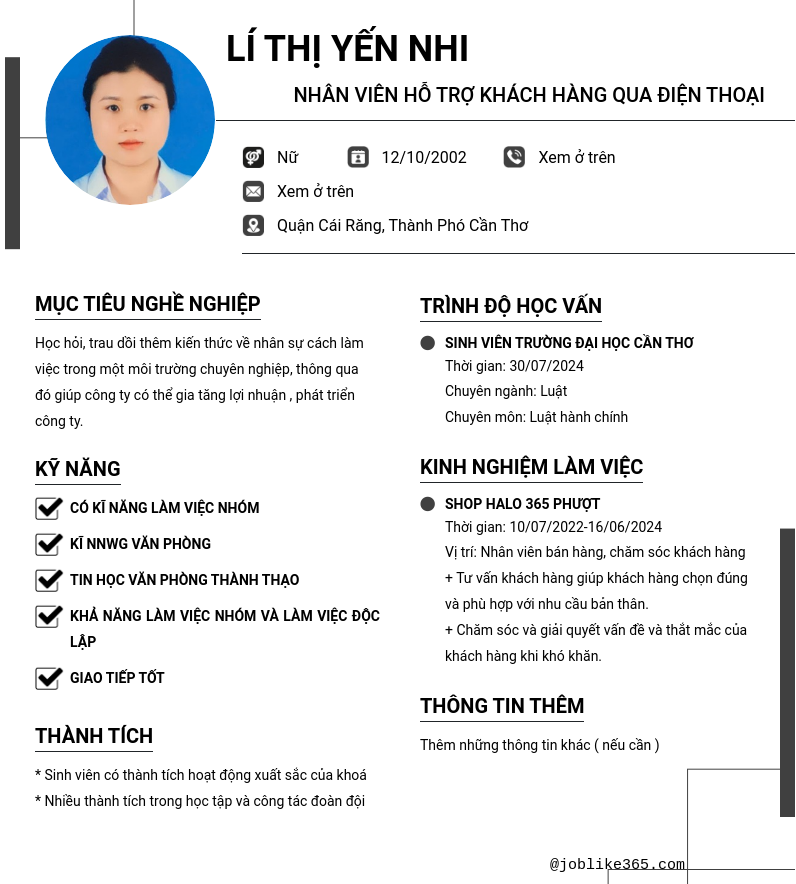 Xem hồ sơ ứng viên Lí Thị Yến Nhi cần 2 điểm. Hồ sơ được cập nhật ngày: 19/11/2024