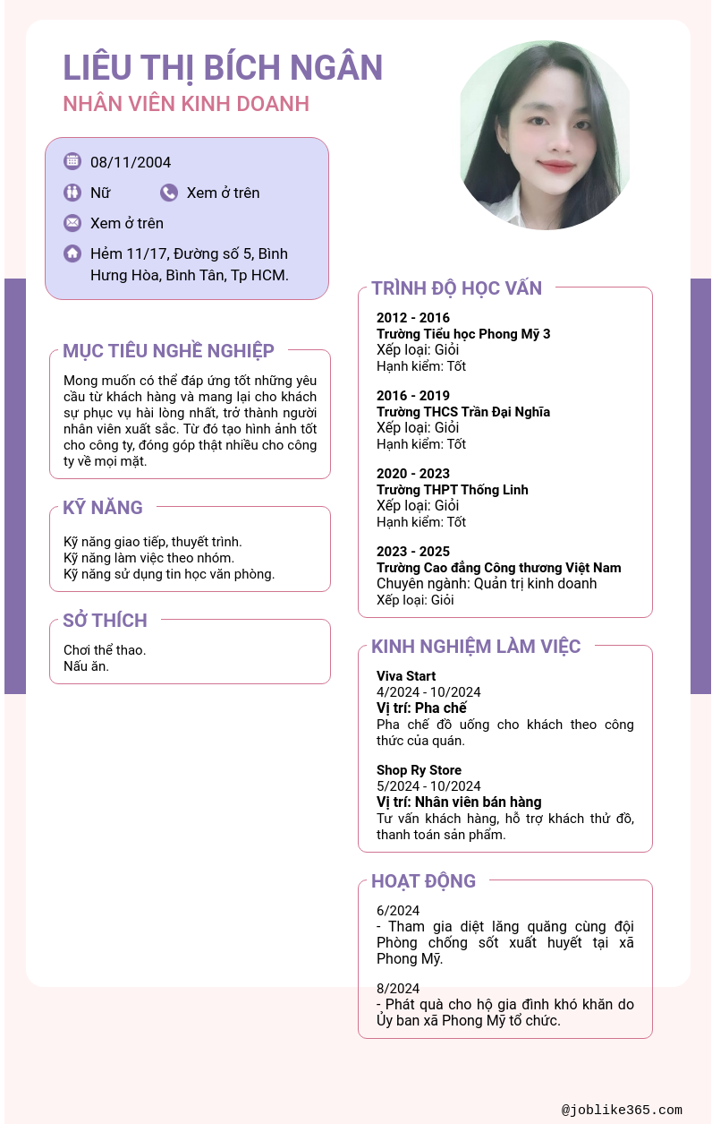 Xem hồ sơ ứng viên Liêu thị bích ngân cần 2 điểm. Hồ sơ được cập nhật ngày: 01/11/2024