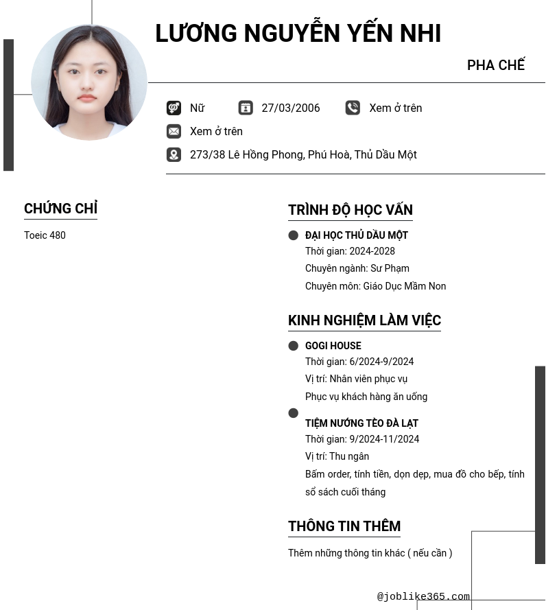 Xem hồ sơ ứng viên Lương Nguyễn Yến Nhi cần 2 điểm. Hồ sơ được cập nhật ngày: 09/12/2024