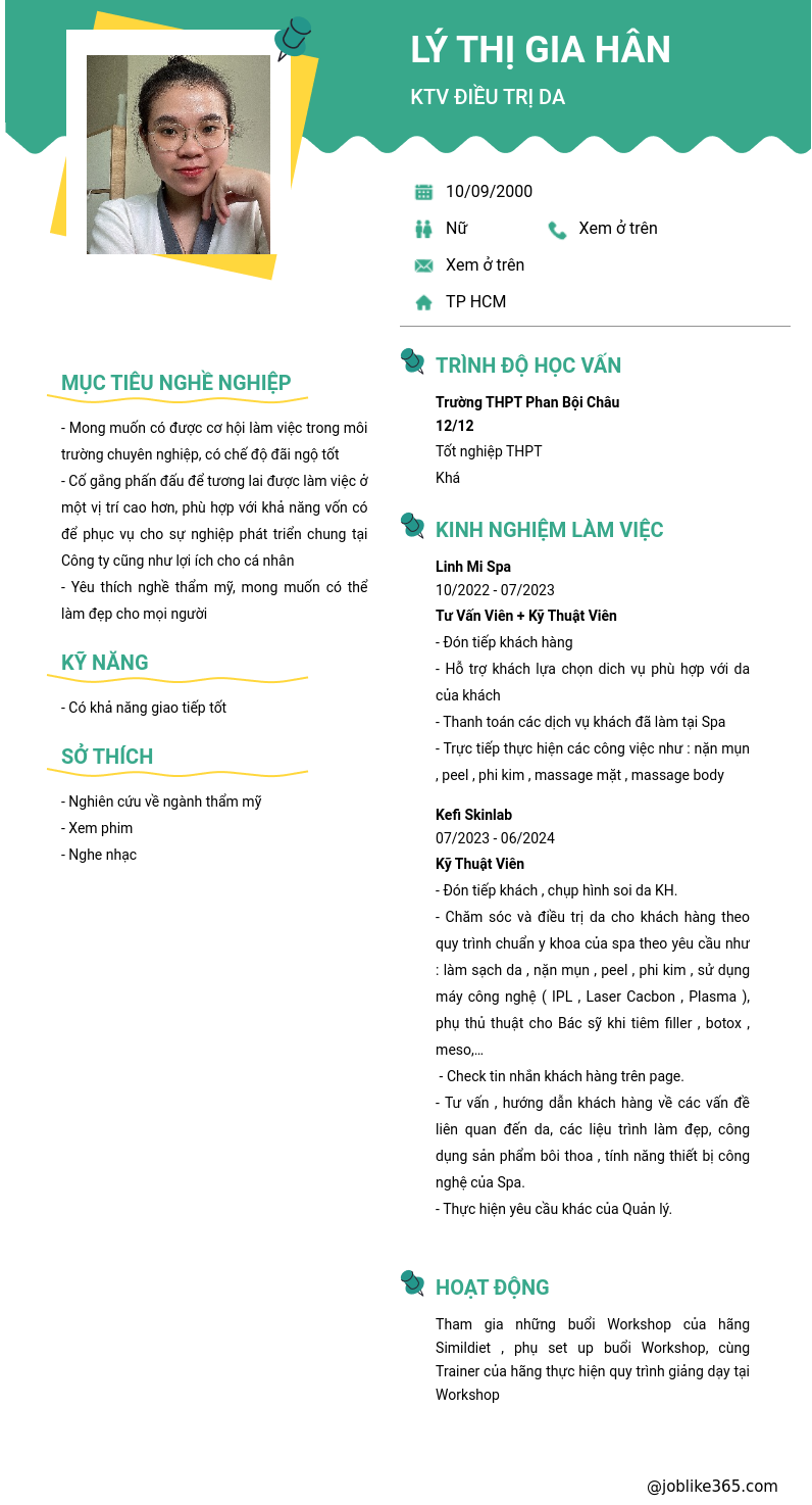 Xem hồ sơ ứng viên LÝ THỊ GIA HÂN cần 2 điểm. Hồ sơ được cập nhật ngày: 26/02/2025