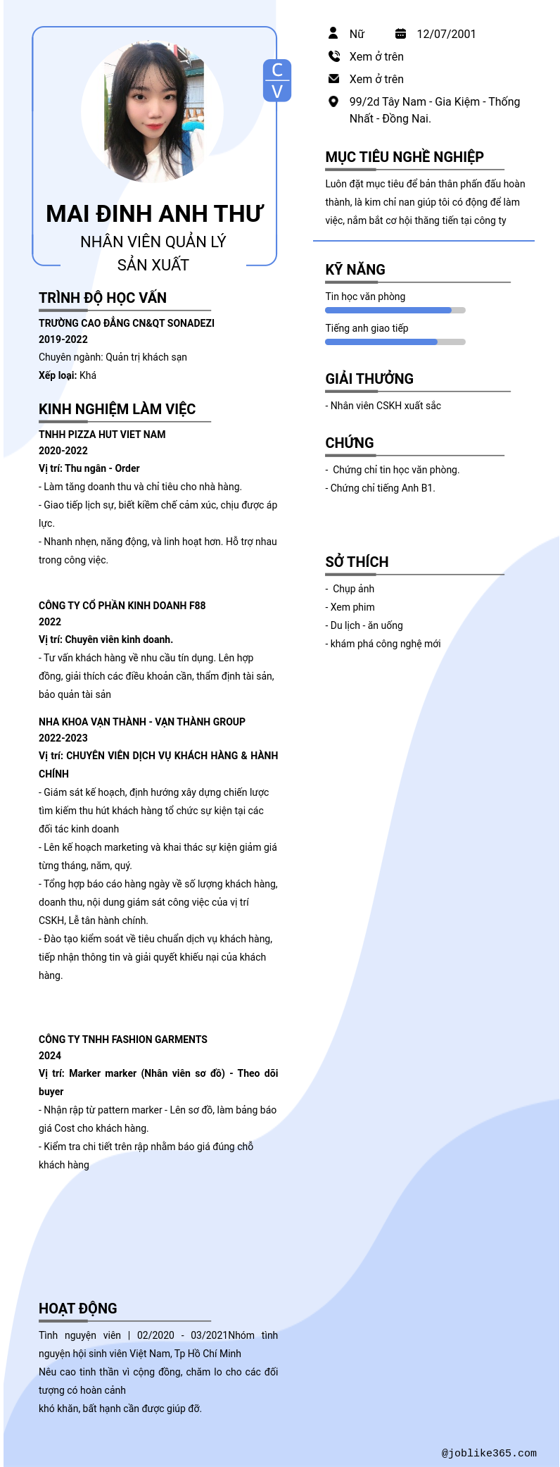Xem hồ sơ ứng viên Mai Đinh anh Thư cần 2 điểm. Hồ sơ được cập nhật ngày: 02/10/2024