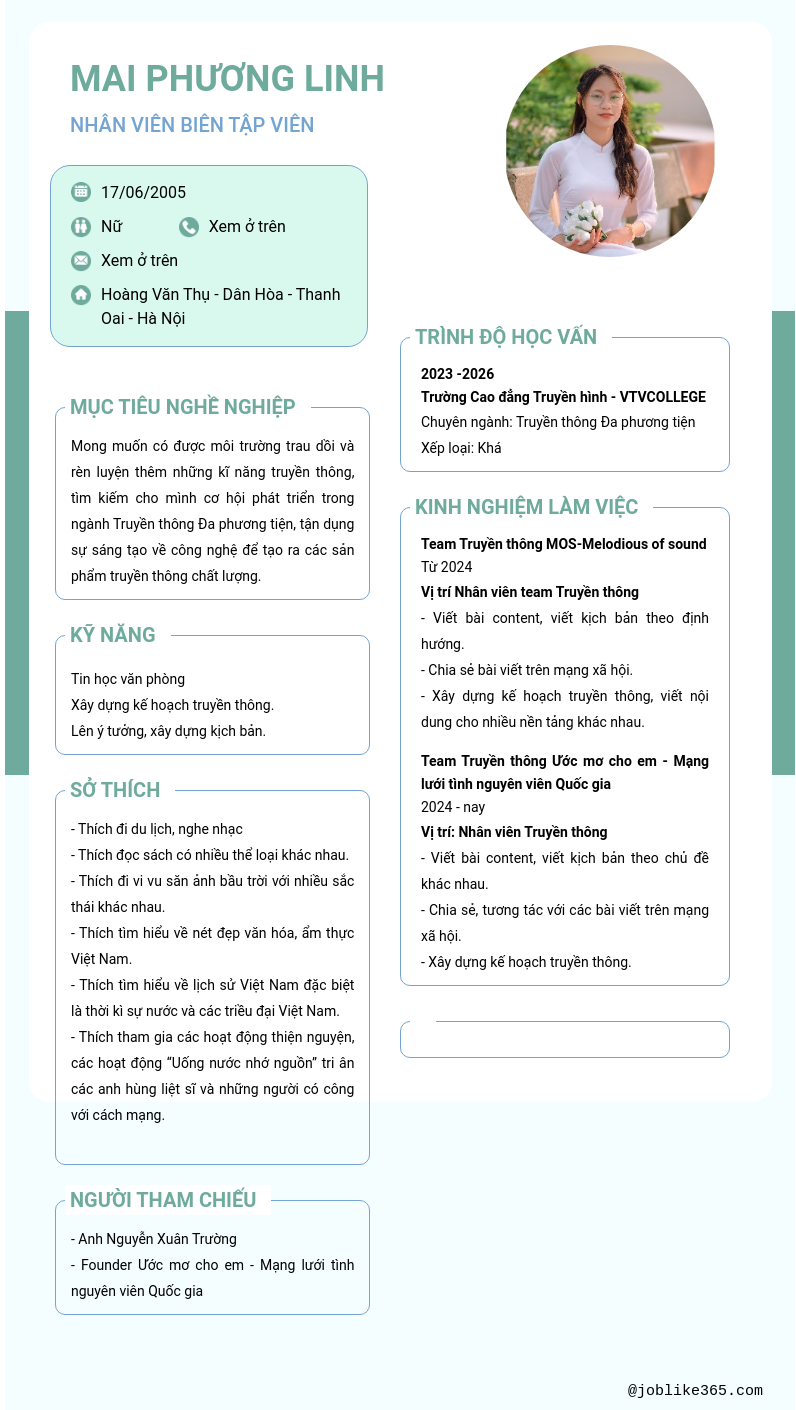 Xem hồ sơ ứng viên Mai Phương Linh cần 2 điểm. Hồ sơ được cập nhật ngày: 23/08/2024