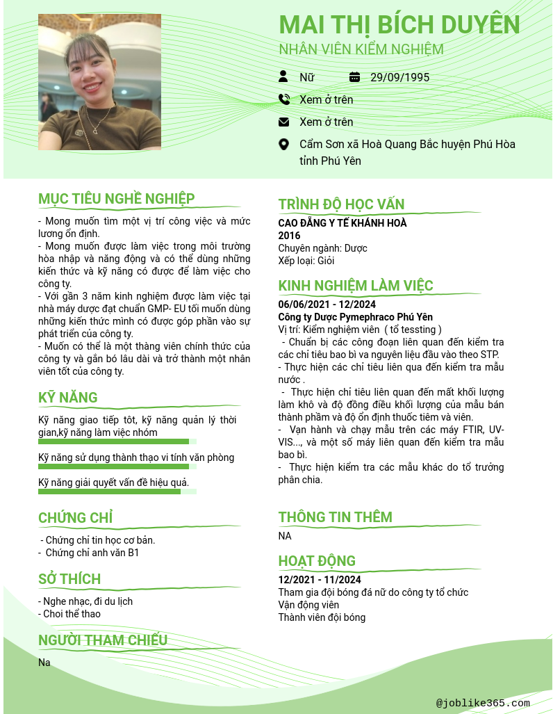 Xem hồ sơ ứng viên Mai THỊ BÍCH DUYÊN cần 2 điểm. Hồ sơ được cập nhật ngày: 13/09/2025