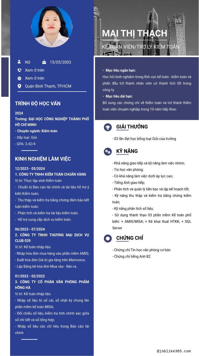 Xem hồ sơ ứng viên Mai Thị Thạch cần 2 điểm. Hồ sơ được cập nhật ngày: 05/10/2024