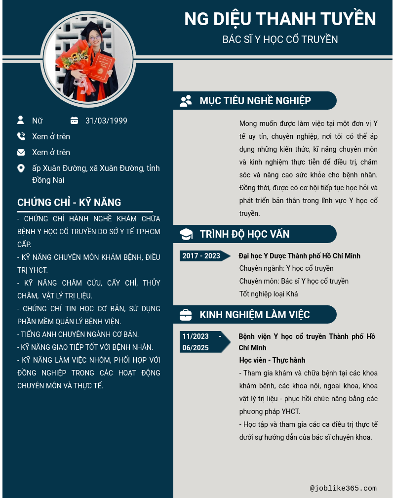 Xem hồ sơ ứng viên ng diệu thanh tuyền cần 2 điểm. Hồ sơ được cập nhật ngày: 25/02/2026