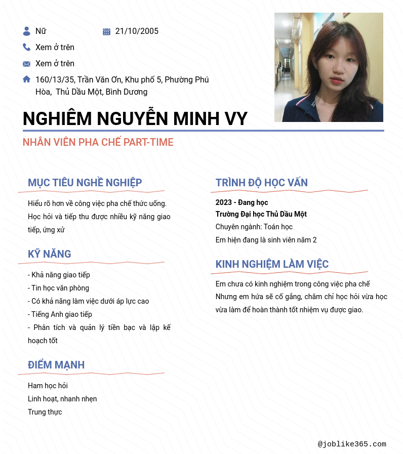 Xem hồ sơ ứng viên Nghiêm Nguyễn Minh Vy cần 2 điểm. Hồ sơ được cập nhật ngày: 04/10/2024