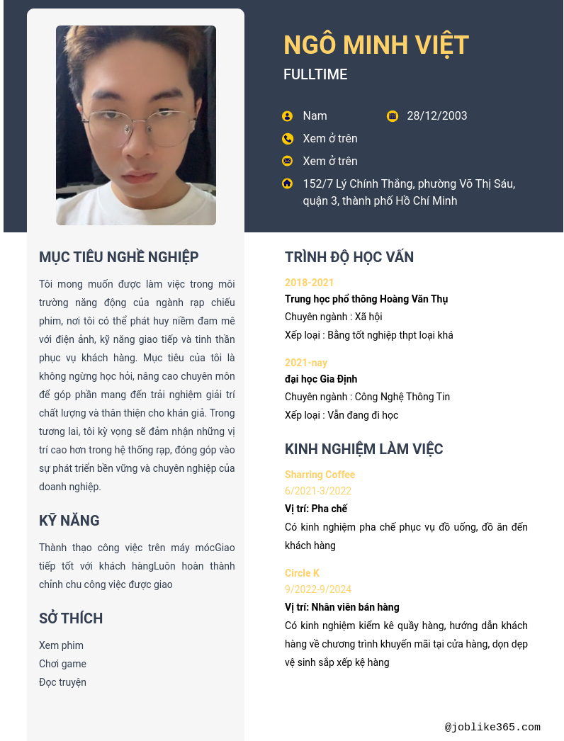 Xem hồ sơ ứng viên Ngô Minh Việt cần 2 điểm. Hồ sơ được cập nhật ngày: 17/04/2025