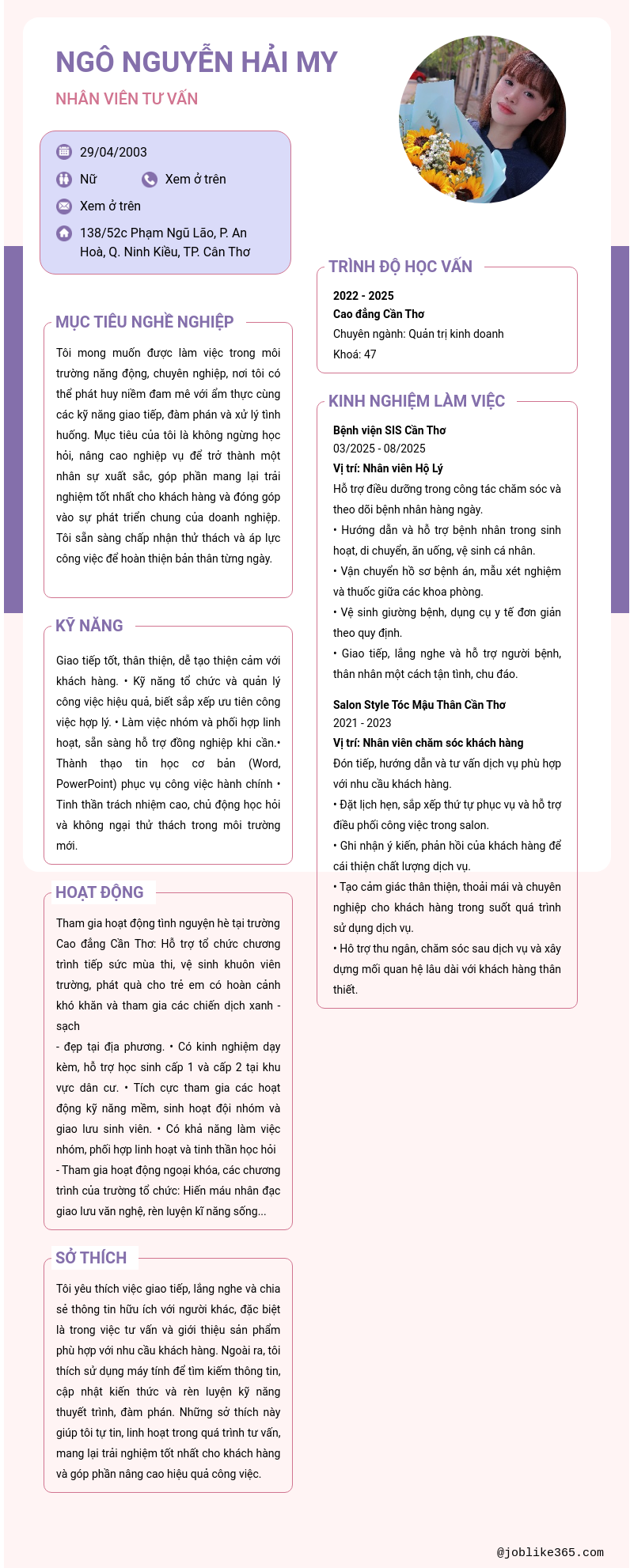 Xem hồ sơ ứng viên NGÔ NGUYỄN HẢI MY cần 2 điểm. Hồ sơ được cập nhật ngày: 18/08/2025