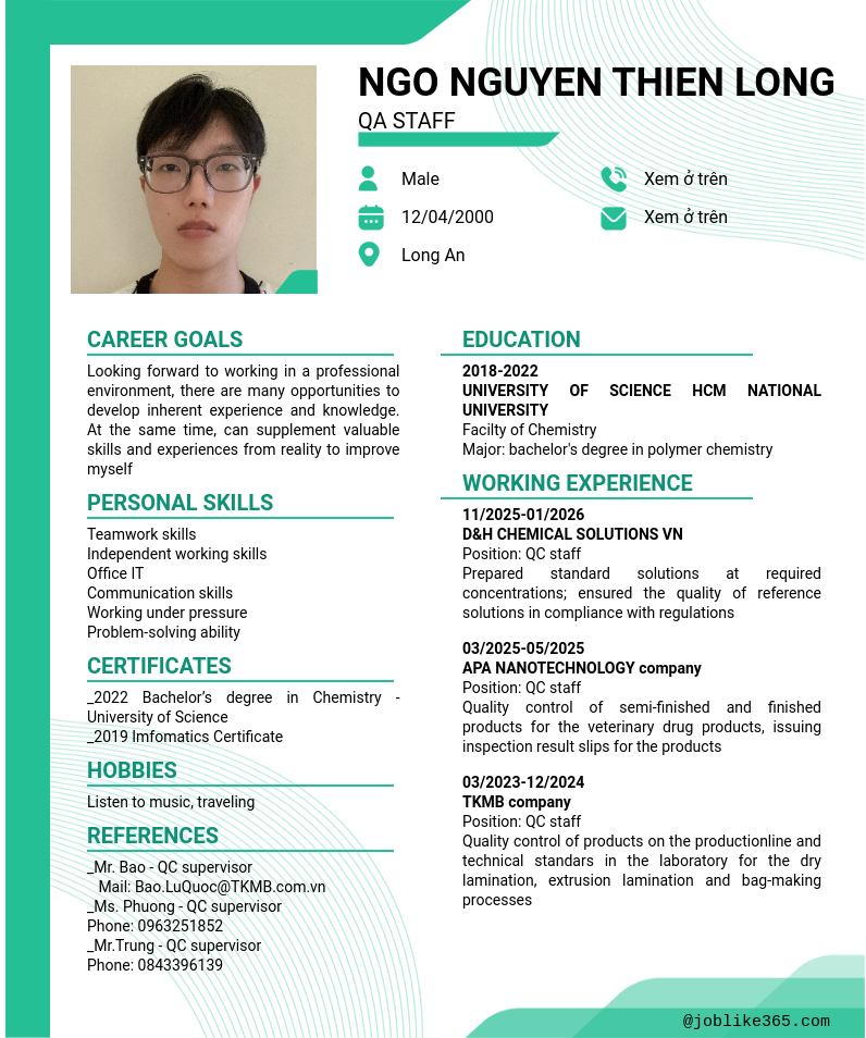 Xem hồ sơ ứng viên ngo nguyen thien long cần 2 điểm. Hồ sơ được cập nhật ngày: 15/02/2026