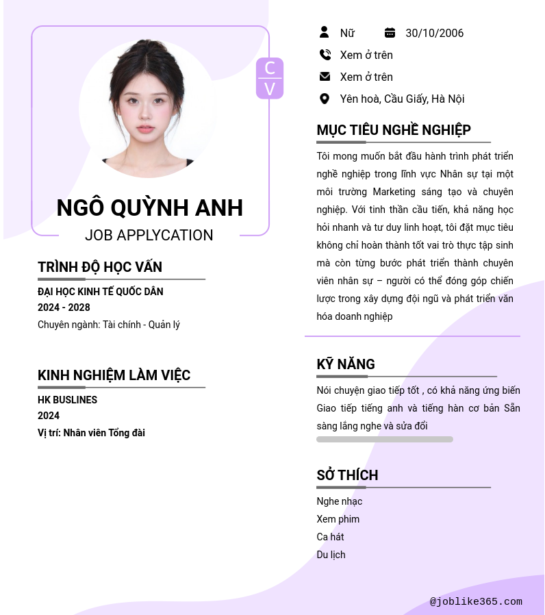 Xem hồ sơ ứng viên Ngô Quỳnh Anh cần 2 điểm. Hồ sơ được cập nhật ngày: 04/09/2025