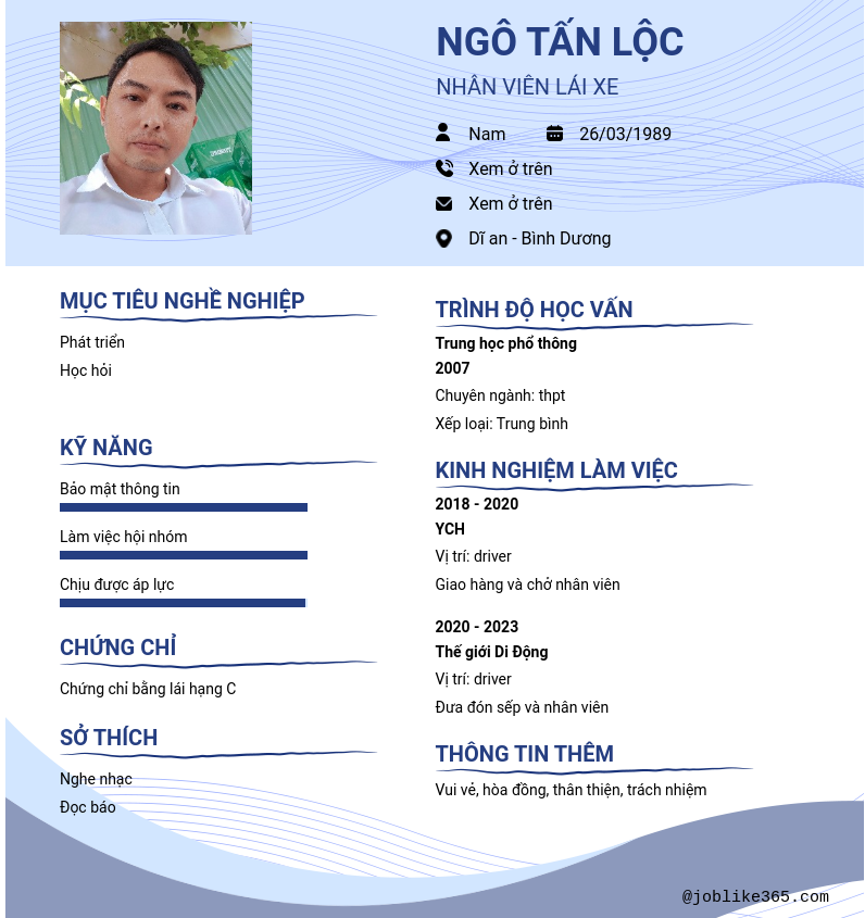 Xem hồ sơ ứng viên NGÔ TẤN LỘC cần 2 điểm. Hồ sơ được cập nhật ngày: 22/10/2024