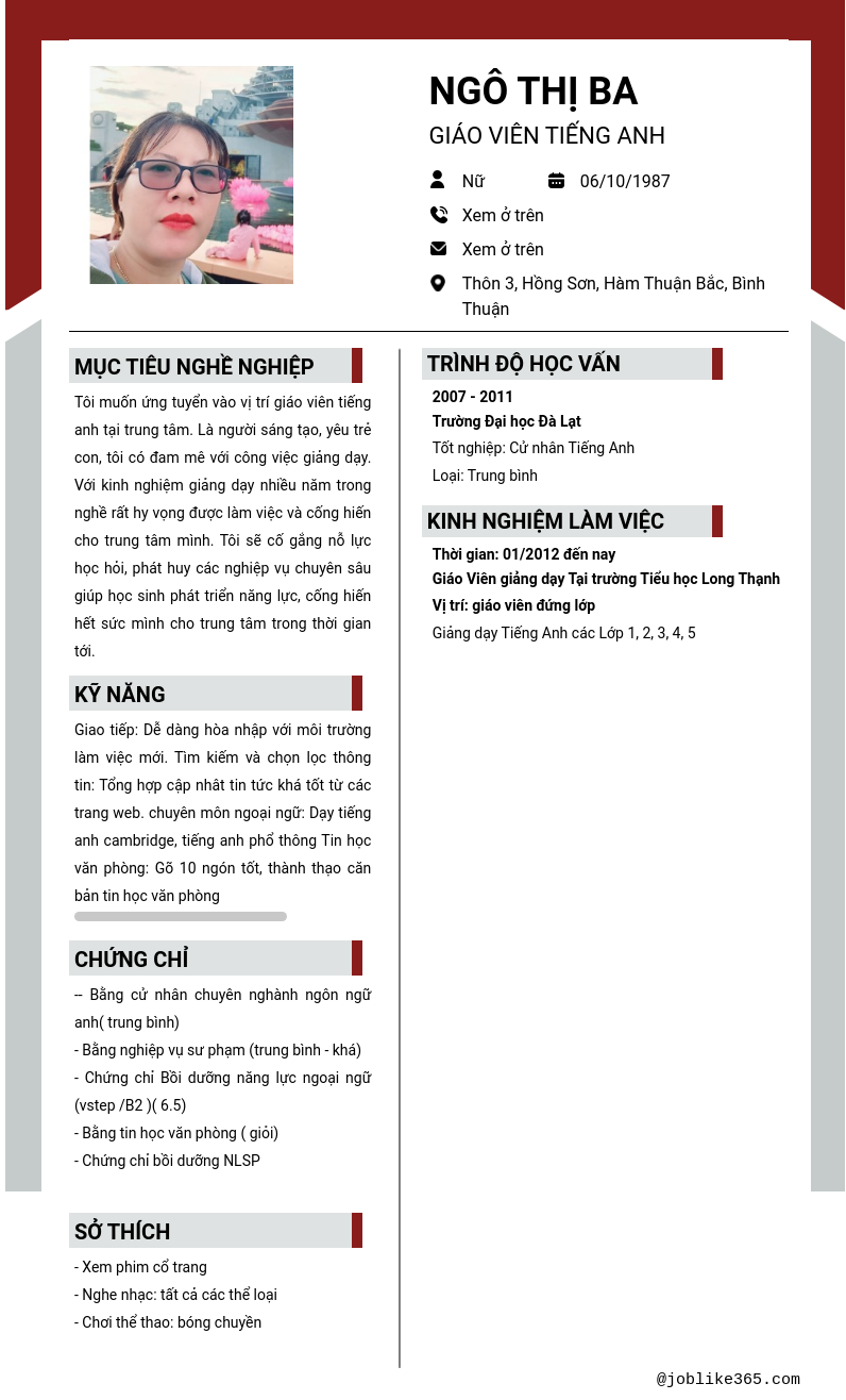 Xem hồ sơ ứng viên NGÔ THỊ BA cần 2 điểm. Hồ sơ được cập nhật ngày: 10/06/2025