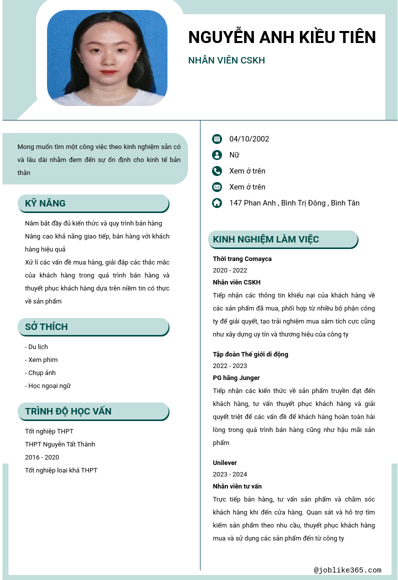 Xem hồ sơ ứng viên NGUYỄN ANH KIỀU TIÊN cần 2 điểm. Hồ sơ được cập nhật ngày: 01/11/2024
