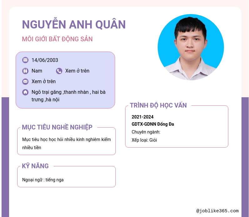 Xem hồ sơ ứng viên Nguyễn Anh Quân cần 2 điểm. Hồ sơ được cập nhật ngày: 15/07/2024