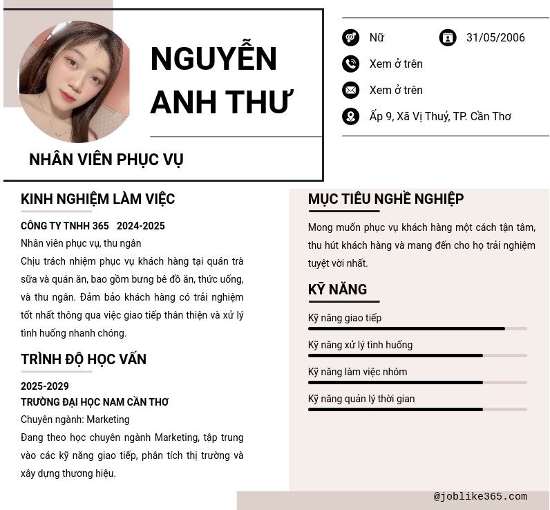 Xem hồ sơ ứng viên Nguyễn anh thư cần 2 điểm. Hồ sơ được cập nhật ngày: 03/09/2025