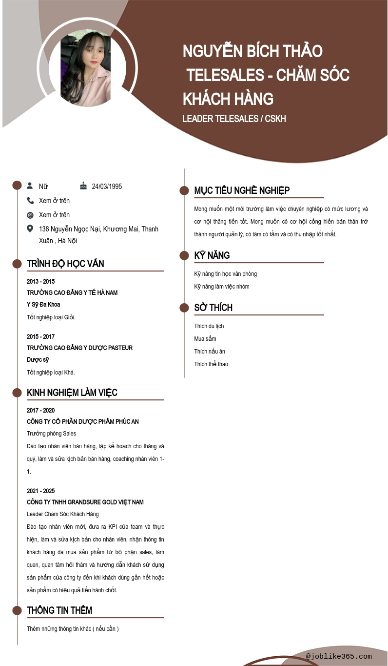 Xem hồ sơ ứng viên NGUYỄN BÍCH THẢO TELESALES - CHĂM SÓC KHÁCH HÀNG cần 2 điểm. Hồ sơ được cập nhật ngày: 24/09/2025