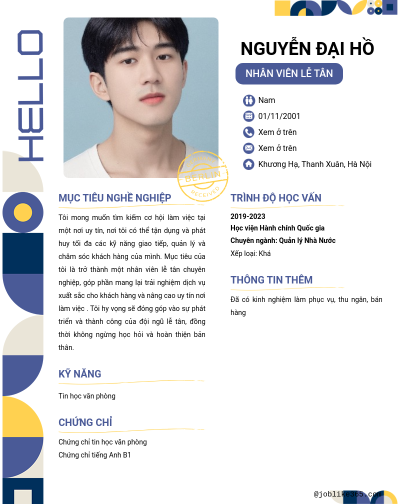 Xem hồ sơ ứng viên Nguyễn Đại Hồ cần 2 điểm. Hồ sơ được cập nhật ngày: 28/07/2024