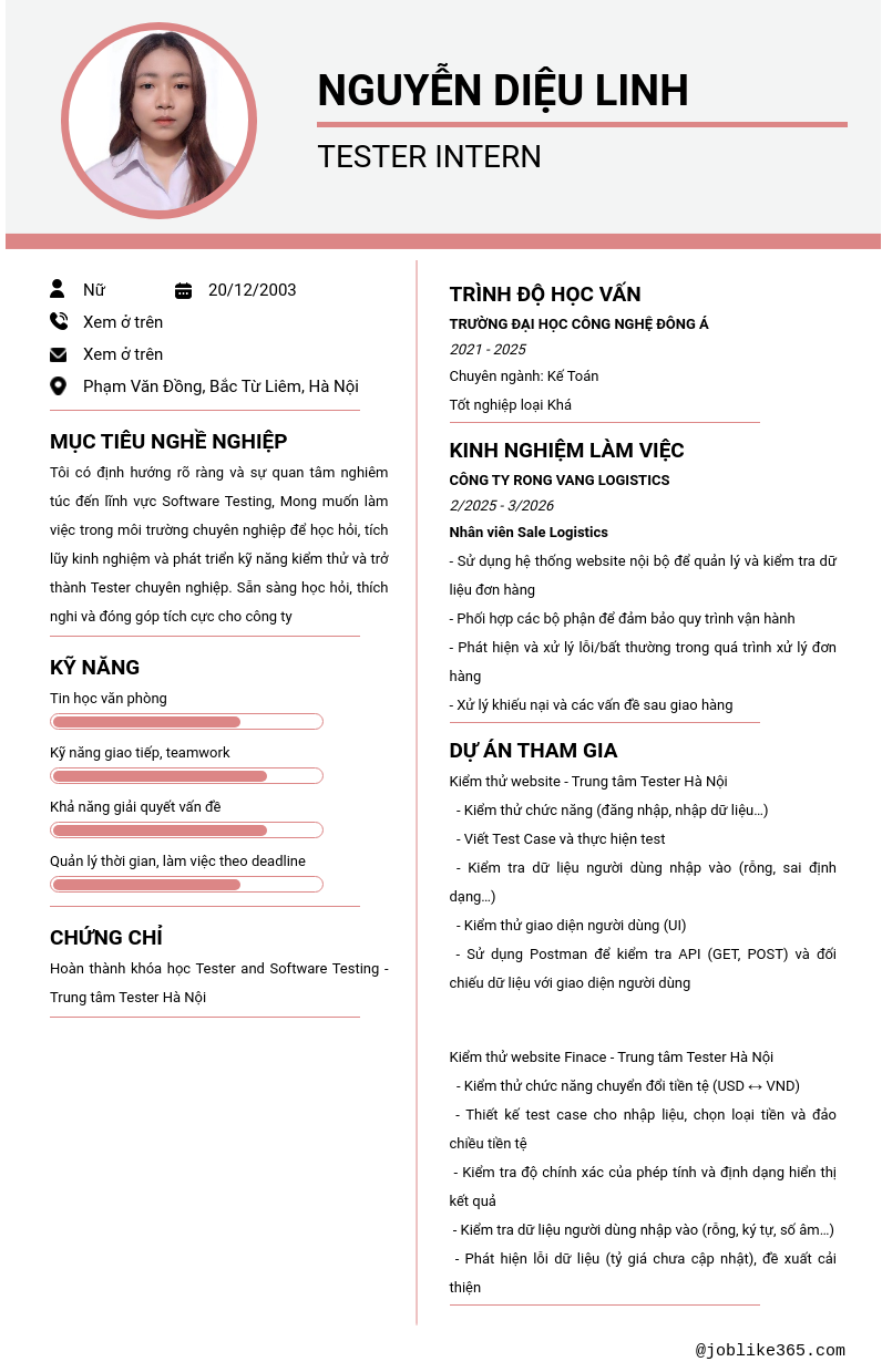 Xem hồ sơ ứng viên Nguyễn Diệu Linh cần 2 điểm. Hồ sơ được cập nhật ngày: 27/03/2026