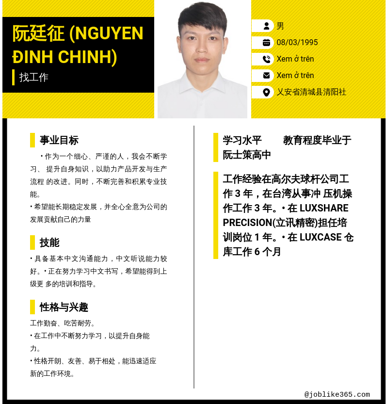 Xem hồ sơ ứng viên 阮廷征 (NGUYEN ĐINH CHINH) cần 2 điểm. Hồ sơ được cập nhật ngày: 25/06/2025