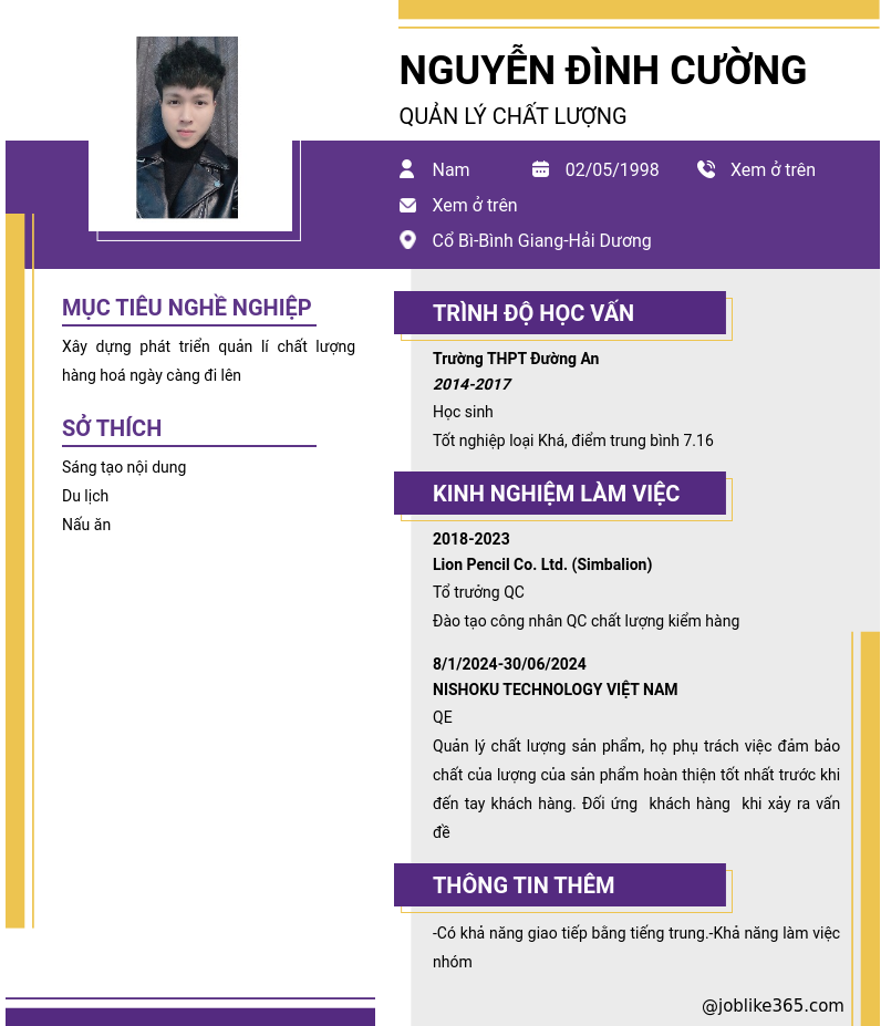 Xem hồ sơ ứng viên NGUYỄN ĐÌNH CƯỜNG cần 2 điểm. Hồ sơ được cập nhật ngày: 30/06/2024