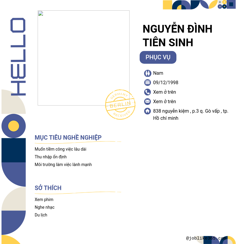 Xem hồ sơ ứng viên Nguyễn Đình Tiên Sinh cần 2 điểm. Hồ sơ được cập nhật ngày: 09/06/2025