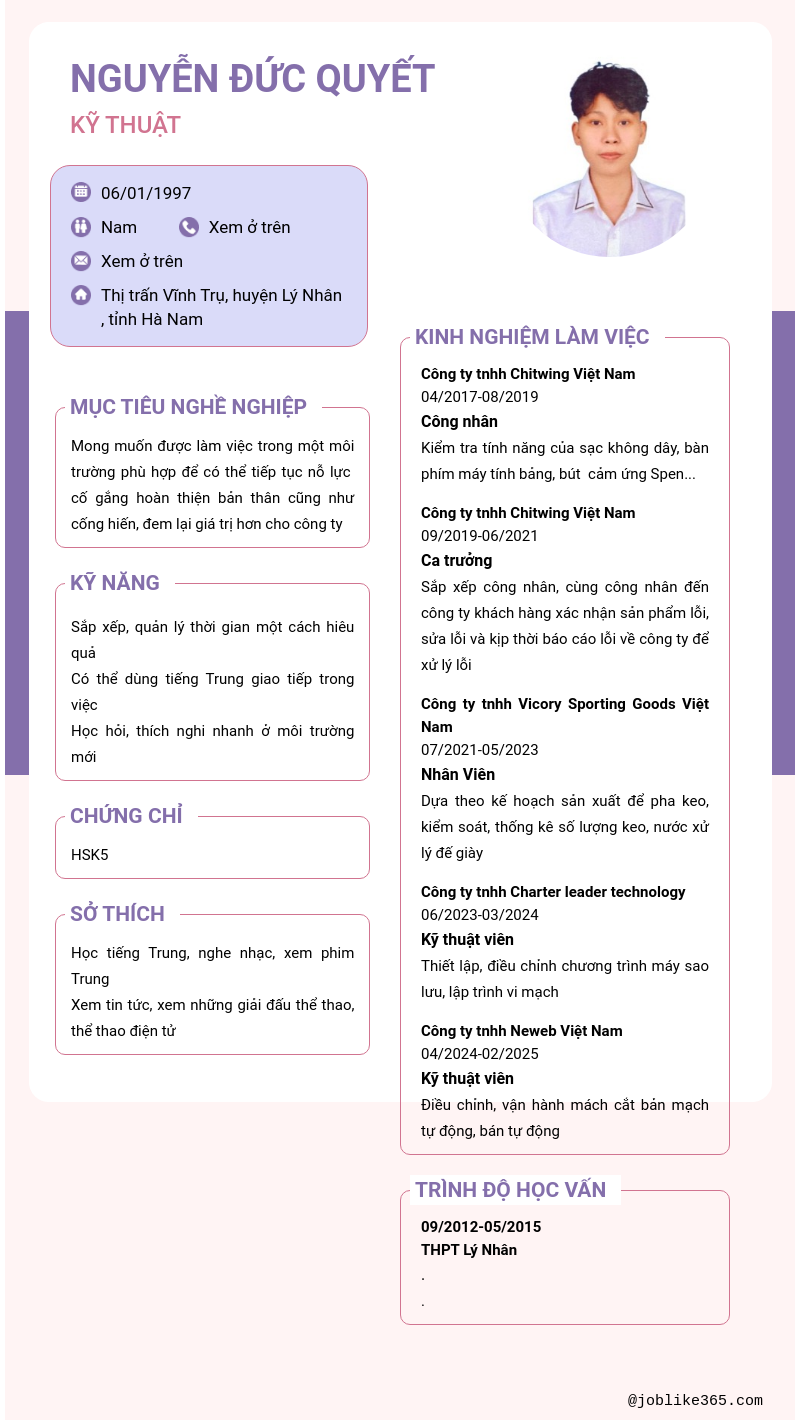 Xem hồ sơ ứng viên Nguyễn đức QUYẾT cần 2 điểm. Hồ sơ được cập nhật ngày: 23/02/2025