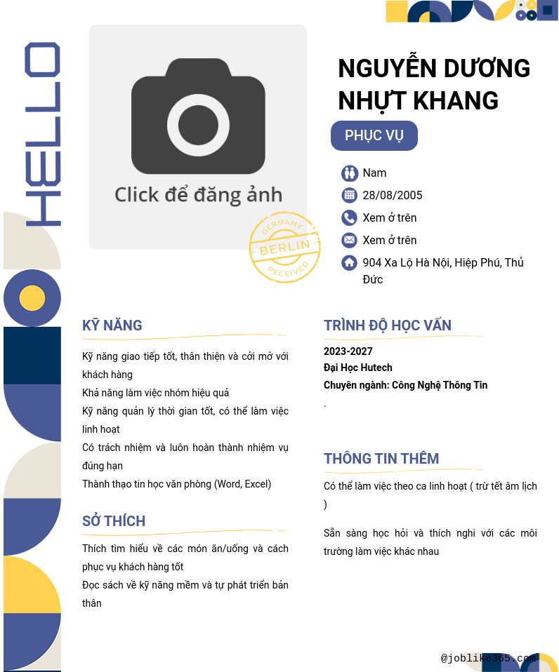 Xem hồ sơ ứng viên Nguyễn Dương NHỰT KHANG cần 2 điểm. Hồ sơ được cập nhật ngày: 12/11/2024