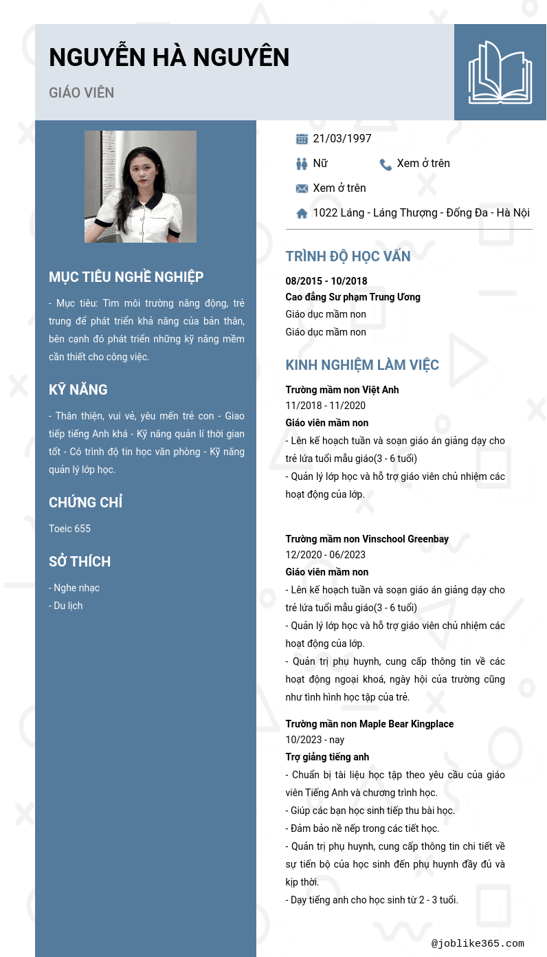 Xem hồ sơ ứng viên NGUYỄN HÀ NGUYÊN cần 2 điểm. Hồ sơ được cập nhật ngày: 01/08/2024