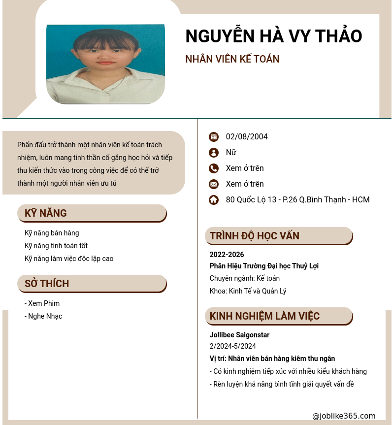 Xem hồ sơ ứng viên NGUYỄN HÀ VY THẢO cần 2 điểm. Hồ sơ được cập nhật ngày: 01/07/2024