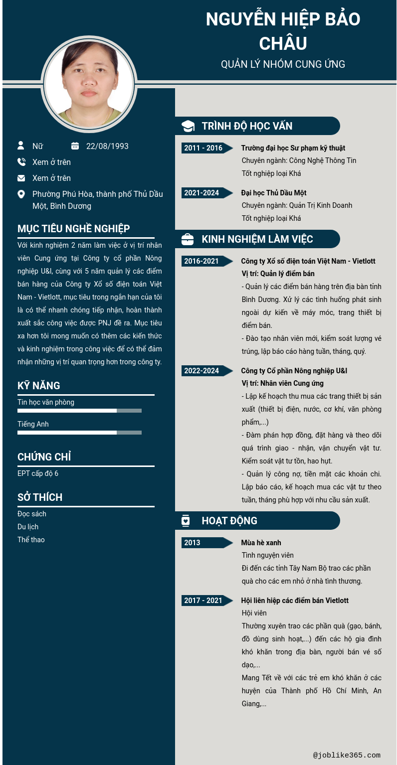 Xem hồ sơ ứng viên NGUYỄN HIỆP BẢO CHÂU cần 2 điểm. Hồ sơ được cập nhật ngày: 31/07/2024