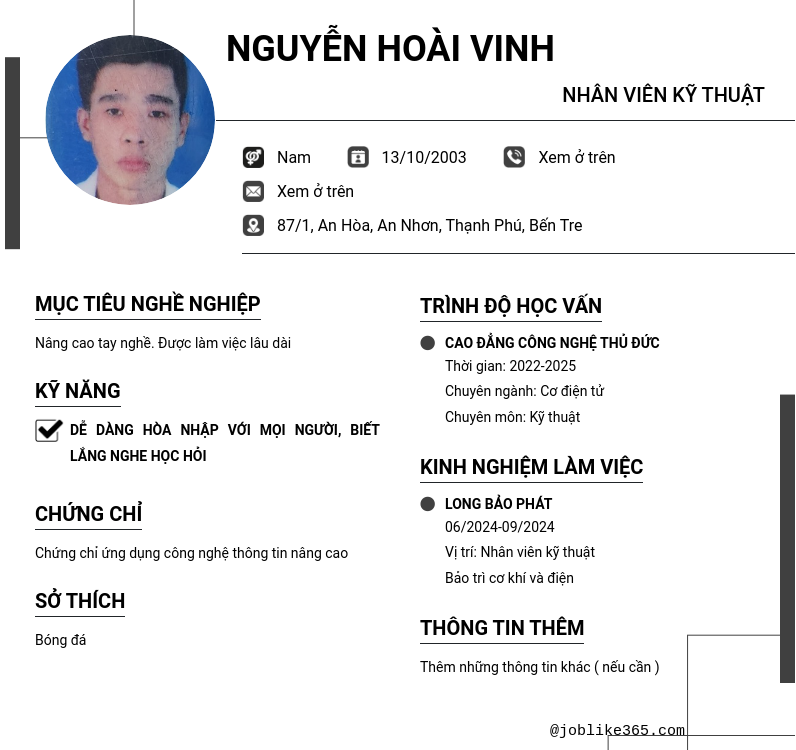 Xem hồ sơ ứng viên Nguyễn Hoài Vinh cần 2 điểm. Hồ sơ được cập nhật ngày: 21/09/2024