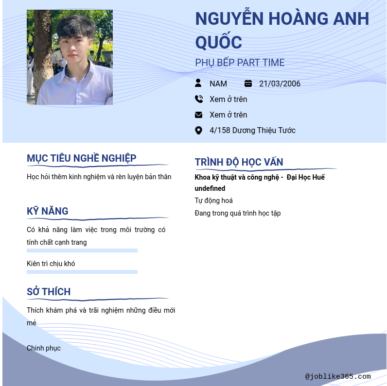 Xem hồ sơ ứng viên Nguyễn Hoàng Anh Quốc cần 2 điểm. Hồ sơ được cập nhật ngày: 08/11/2024