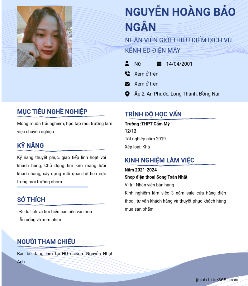Xem hồ sơ ứng viên NGUYỄN HOÀNG BẢO NGÂN cần 2 điểm. Hồ sơ được cập nhật ngày: 26/09/2024